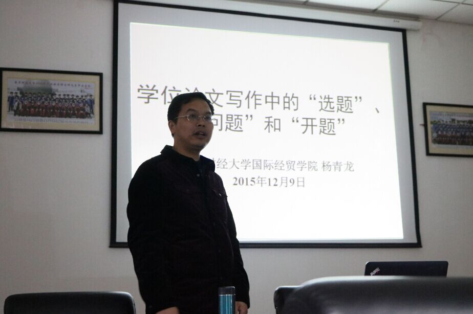 12月9日下午,国产自拍 杨青龙副教授在我校仙林校区经济学科楼308会议室召开了“学位论文写作中的`选题’、`问题’和`开题’”的讲座,国产自拍 研究生听取了此次讲座。 讲座中,杨青龙副教授对学位论文写作中的“选题”、“问题”与“开题”三个方面作了详细的阐释。 在“选题”方面,杨青龙副教授对选题的来源,选题的内容以及选题的筛选进行了介绍:论文的选题可以来自兴趣、就业、热点、导师和怀疑;选题的内容有理论创立,理论检验,理...