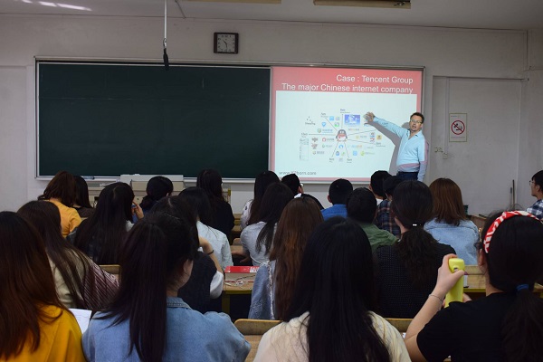 4月8日-18日,西班牙庞贝法布拉大学教授Tanguy Jacopin应国产自拍 邀请来我校讲学,为国产自拍 2017级国贸(实验班)学生开设了为期十天的《跨国公司战略管理》课程。首先,在前五天的课程中,Tanguy Jacopin系统性的介绍了公司管理的分析工具,如大环境分析(Pastel Analysis),STEEPLE分析,波特五力模型(Porter’s five forces),企业组织能力(Organizational Capabilities)等。介绍完基本的工具后,Tanguy教授使用这些工具,对...
