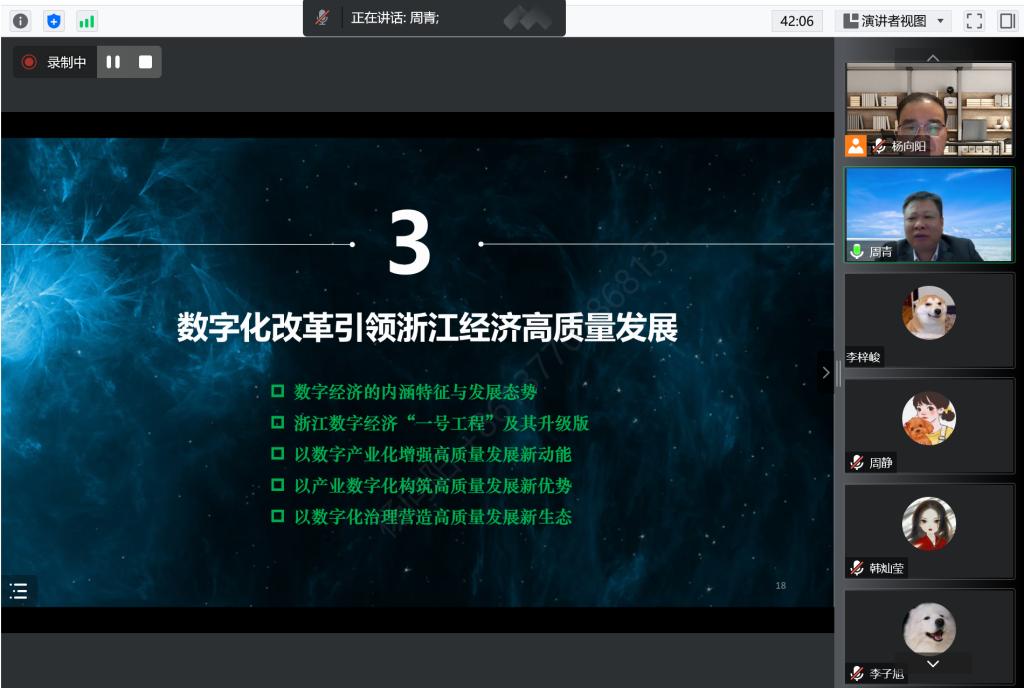 周青教授的讲座框架清晰、内容详实,对于学生快速把握数字经济发展的深刻内涵、浙江省推动数字经济的有力抓手和浙江数字经济发展现状具有重要意义,丰富了大家对数字经济发展在实践层面的认知,对数字经济在经济高质量发展中的地位有了进一步了解,具有很强的指导性和实用性。在讨论交流环节,参加讲座的师生就中小微企业数字化转型障碍、新型研发机构发展定位等话题进行了提问,周青教授结合自身研究经验和其他省份情况进行了详细地解答,现场交流互动积极,学术氛围浓厚。