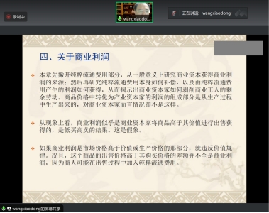 王晓东教授的讲座内容在简要梳理西方经济理论演进的基础上,认为应重视马克思流通理论,这样才能对分工与交易有更加清楚的认识、理解与判断。具体来看:第一,商品经营资本是商业资本的一个亚种,正确理解与阐释其运行过程,对于理解其内涵本身十分重要,对于当前思考大型超市与百货商场引入通道费、联营制模式等商贸流通现象同样具有积极启示;第二,流通费用是资本在流通领域运动发生的费用,与流通成本并非完全等同,考察其构成的基本内涵与表现形式,可以更好地解析快速上涨的广告费用、重要商品特别是农产品储备制度,对于正确理解现代流通体系具有十分重要的指导价值;第三,从商业劳动来看,流通领域既存在直接形成价值的生产性劳动,也包含不创造价值而推动价值实现的媒介性劳动,特别是后者在网络技术快速发展与广泛应用条件下,使得流通业功能从此前的“排水渠”向“引水渠”转变;第四,商业利润是商业资本按自己的资本量所占有的一部分剩余价值,商业资本与产业资本相互竞争而导致利润率的平均化,由此揭示商业利润从何而来的秘密;第五,流通时间对剩余价值生产的消极作用,在现象层面上颠倒地表现为流通时间对利润的积极作用,商人的流通时间节约效应体现在快速通过而非商业暴利,成功的零售商追求薄利快销和快买快卖。