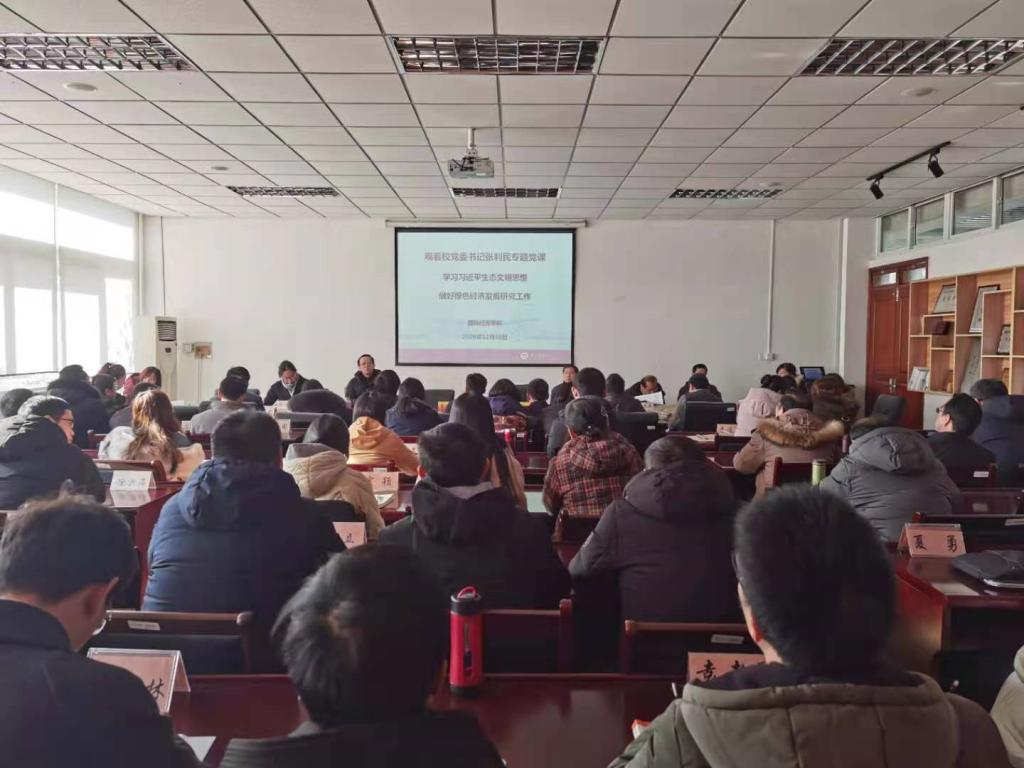 12月16日,国产自拍 组织全体教职工在德经楼308会议室集中观看校党委书记张利民专题党课《学习习近平生态文明思想 做好绿色经济发展研究工作》。