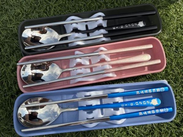 学生设计并定制的餐具,“国小猫喊你吃饭啦”“光盘行动,有你有我”等可爱字样赫然印刻在餐具盒上,新生开学日期“2020.9.13”和国贸院的吉祥物国小猫也出现在铁质筷子和勺子上。