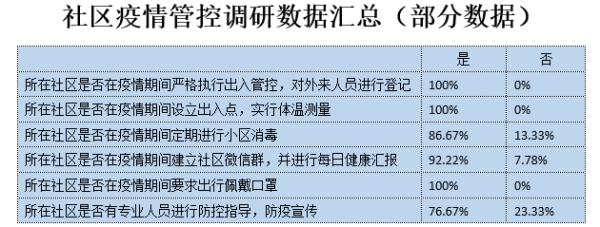 社区防控措施方面,问卷结果显示,在疫情尚未得到充分控制的2至5月,大部分社区都进行了紧急管控,实施诸如小区消毒,设立体温测量点等措施。大部分社区组织体系较为完善,能够充分发挥制度优势,第一时间启动联防联控机制,将责任落实到人,全面排查,实时监测。