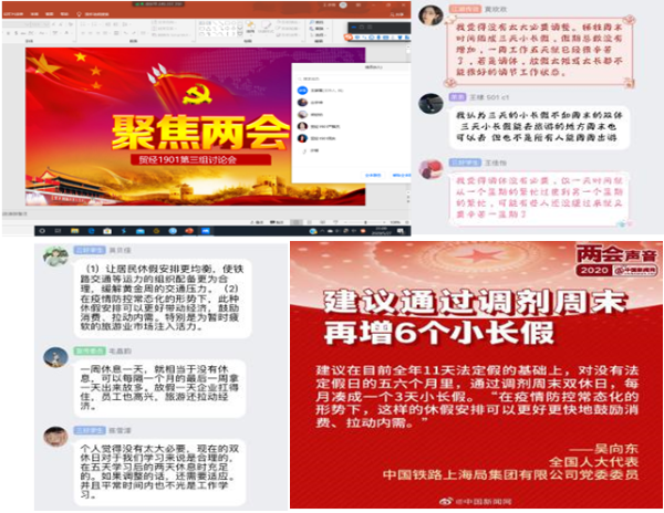 学院各个团支部分别针对两会中的“建议开设国家级心理健康平台”、“建议细化校园欺凌惩治标准”、“保护知识产权”、“制定个人信息保护法”等关系民生及社会发展的问题展开热议,发出青年声音。