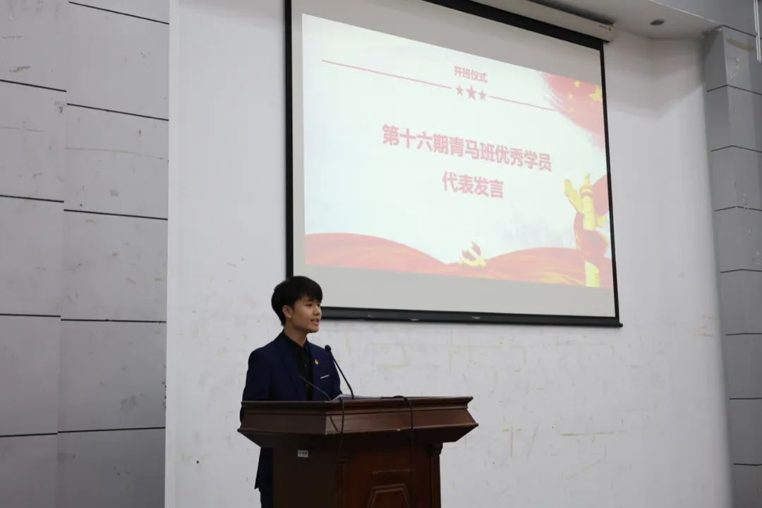 以榜样为记,凝聚力量。第十六期青马班优秀学员代表发言,国贸2304秦启航分享在青马班期间的学习历程与收获。他表示,青马班的学习洗涤心灵,坚定信念,了解前人走过的红色印记,接受先进思想的指引,而自己日后站在现在与未来的交汇,亦能有拨云日开,勇登高山的姿态。过往种种皆是脚踏实地的硕果,句句应铭心,激励各位学子在学习过程中力争上游,做优争优。