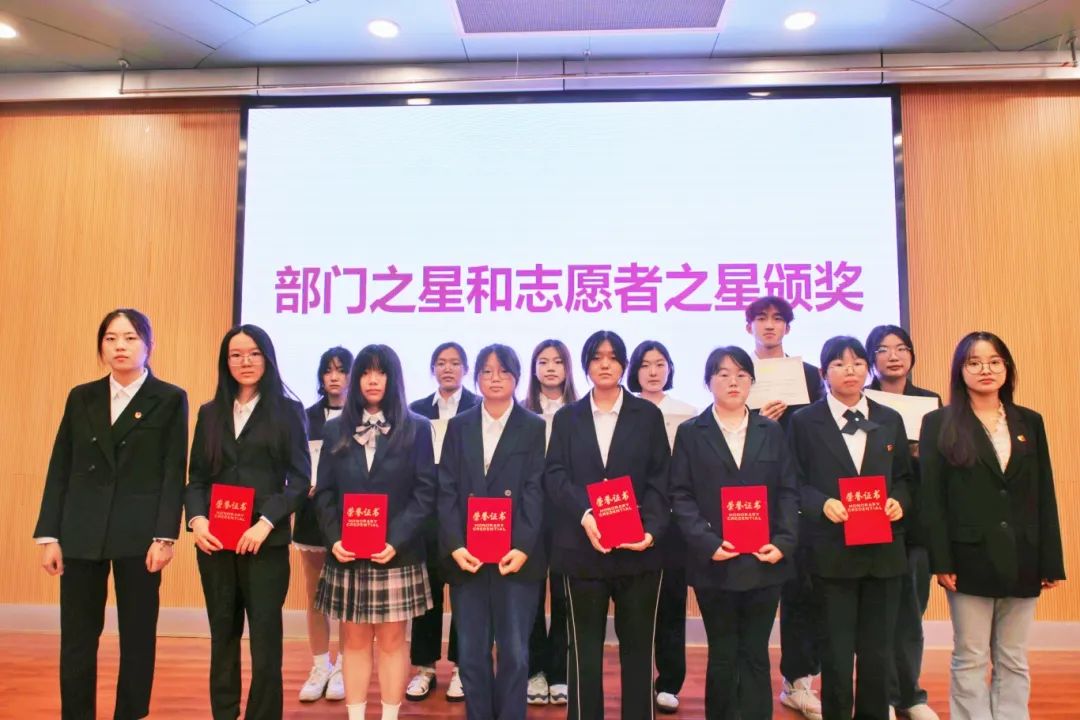 述职结束后,主席团成员丁莹,余苗苗,陈雪子分别对部门中具有突出表现的优秀负责人和志愿者颁发“部门之星”和“志愿者之星”荣誉证书,对他们一年来辛勤的付出表达了衷心的感谢和热烈的祝贺。