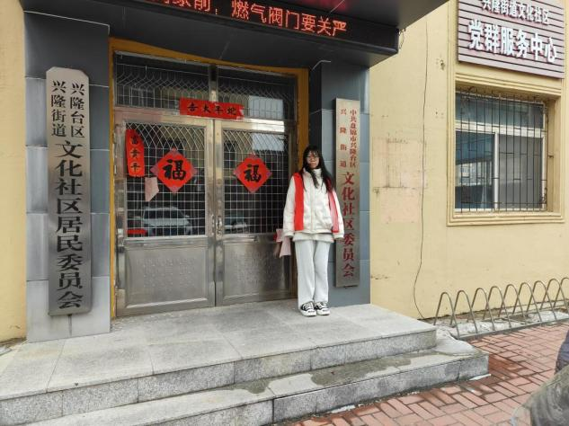 2025年2月8号在辽宁省盘锦市兴隆台区兴隆街道文化社区,邱思彤负责环境卫生与安全维护,包括清理垃圾、整理绿化带、检查公共设施及安全巡查。这次活动让邱思彤深刻体会到社区服务不仅是任务,更是责任和爱的传递。这次经历让她更加珍惜服务时光,坚定了为社区贡献力量的决心。