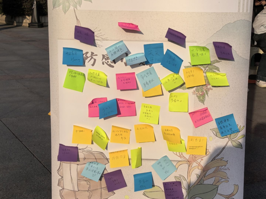 活动伊始,志愿者们手持问卷主动邀约,围绕小雪后流感高发原因、流感与普通感冒的区别等问题展开互动。同学们积极应答,答对者收获暖心小礼品,在轻松氛围中快速掌握实用防感知识。大家在收获知识的同时,也在一旁的“健康留言墙”上留下了温馨的祝福。同学们纷纷拿起便签纸,写下 “小雪过后勤添衣,每天通风一小时”“多喝温水驱寒邪,少去人群密集地” 等个性化防护技巧,一张张便签贴满易拉宝,成为共享防护经验的温馨平台。志愿者穿梭其间,答疑解惑,传递材料,定格精彩瞬间,让活动既富知识性又满含温情。
