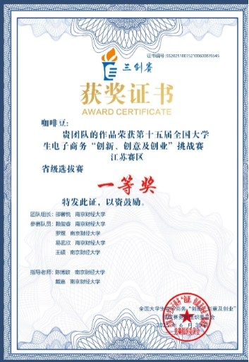 图为第十五届全国大学生电子商务“创新创意创业”挑战赛江苏赛区一等奖 赖玺睿为项目第二负责人