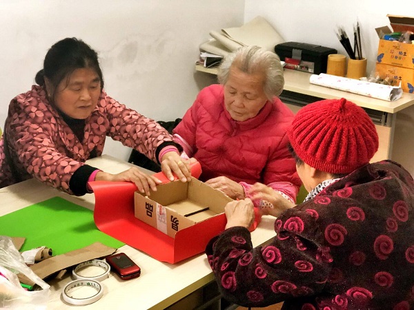 11月23号下午,志愿者们到带着幕府山庄养老社区的老人们将废弃或闲置的盒子变成好看且实用的收纳盒。在将各式各样的快递盒和包装纸分给老人们之后,大家一起开始做收纳盒。杨奶奶一边做一边笑眯眯地和志愿者聊天:“我们家好多这种用不着盒子,平时都不知道要放哪里。你们这些孩子啊,就是有想法,把它们变成洋气的盒子多好看呀。”陈奶奶在志愿者的帮助下做了一个九宫格的收纳盒,做好后陈奶奶开心地转头对志愿者说:“看我们做的盒子,有九个格子!特别适合放在我们家茶几上!”看到老人们十分享受地在做手工,志愿者们也十分享受陪伴老人的时光。志愿者李翼聪同学感慨道:“当一个个简陋的快递盒子穿上五颜六色‘新衣服’,当废弃的盒子变成方便实用的收纳盒,我也想到了我们作为大学生,对待可回收的废弃物应该要有更多的创新想法和惜物意识。”