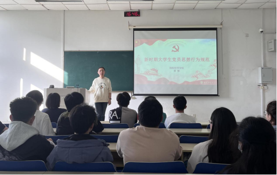 4月21日,国际级国贸学院本科生第四党支部在德经楼102召开以“新时期大学生思想行为规范”为主题的党课。本次党课由书记董敏老师主讲。董老师郑重强调了《中国共产党章程》与党员行为规范的联系,并且立足党的二十大,以党章为根本,强调了坚持制度治党、依规治党,阐释完善党内法规制度体系的重要意义。董老师殷切寄语学员们要自觉学习党章、遵守党章、贯彻党章、维护党章,提升自身行为规范,积极发挥先锋模范作用。