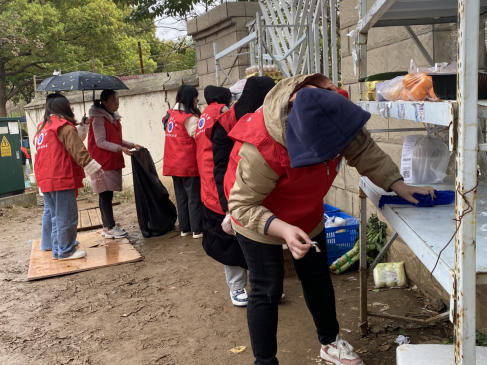 来到学校西门外卖存放点,志愿者们首先对外卖货架沿线的垃圾杂物进行清理。他们分工合作,有的捡拾货架边和杂草丛中的塑料包装袋、果皮;有的手拿扫把清扫草地上的垃圾;有的拿抹布清理货架上的“卫生死角”。大家不怕脏、不怕累,尽管下着雨,现场仍然是一片热火朝天的劳动景象。在大家的相互配合下,不到一个小时,活动现场的垃圾被清理得整洁清爽。