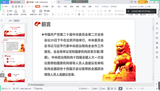 党的发展对象们思想品德素质高,专业知识储备充足,致力于为新时代中国特色社会主义的发展贡献自己的一份力量。7日晚,活动首次在腾讯会议召开,会议内容是观看北京召开的中国共产党第二十届中央委员会第二次全体会议。线上的同学们无不专心致志,时不时还会在发言区发表自己的感想,电子商务2001班的房子韵同学留言道:“只有坚持党的领导,才能让人们的生活更加地富足美满,让我们的国家更加强大。”