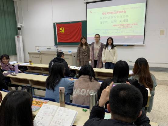 2021年12月11日,国产自拍 国产自拍 本科生第一党支部在在德经楼108教室召开预备党员转正支部大会,讨论本支部汪子欣、赵利、吴川丽3名预备党员按期转正事宜,支部大会由本科生第一党支部书记孙绪华主持,支部大会应到党员48人,实到党员48人,其中有表决权的正式党员8人,实到正式党员8人。