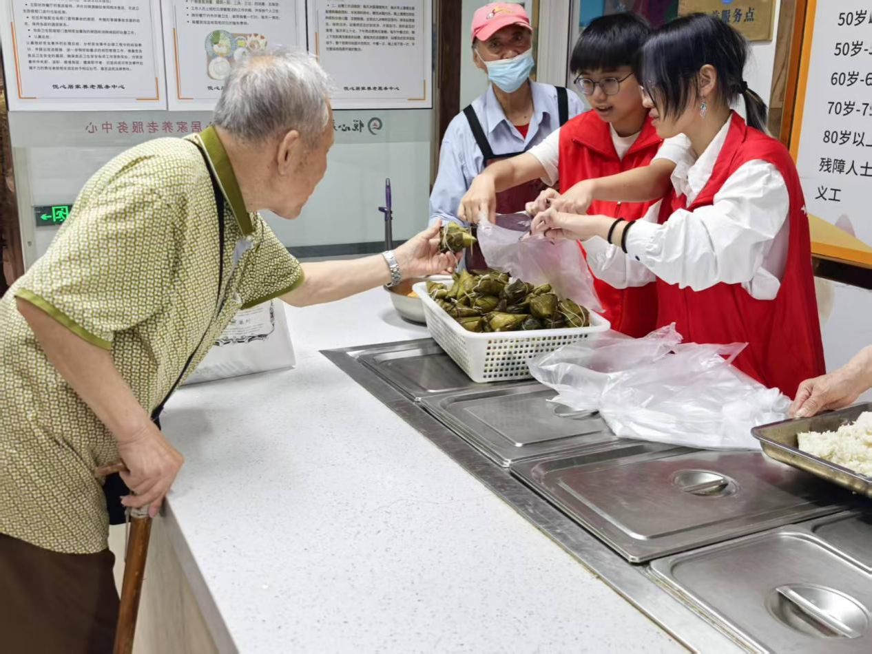 “端午临中夏,时清日复长”,虽然仲夏夜已长,端午佳节已过,但是大家过节的热情不减。悦心居家养老服务中心贴心地为老人准备了粽子,一个粽子寄托着传统文化,历经亘古岁月抚慰着现代人的心灵,传递着丝丝绵绵的温情。在志愿服务的最后,服务中心的阿姨更是热心肠地赠送每名队员一个粽子和若干糖果,队员们品尝着香糯的粽子,感受到了社区大家庭的温暖。