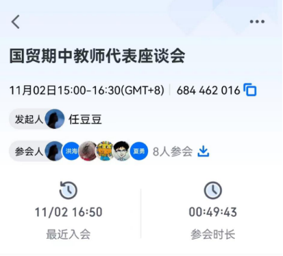 于11月2日15时召开了线上期中教师座谈会,国际经济与贸易、贸易经济和电子商务专业教师代表参会,会议由教学院长徐圆副教授主持。院党委书记张阳军参加会议并做总结发言。