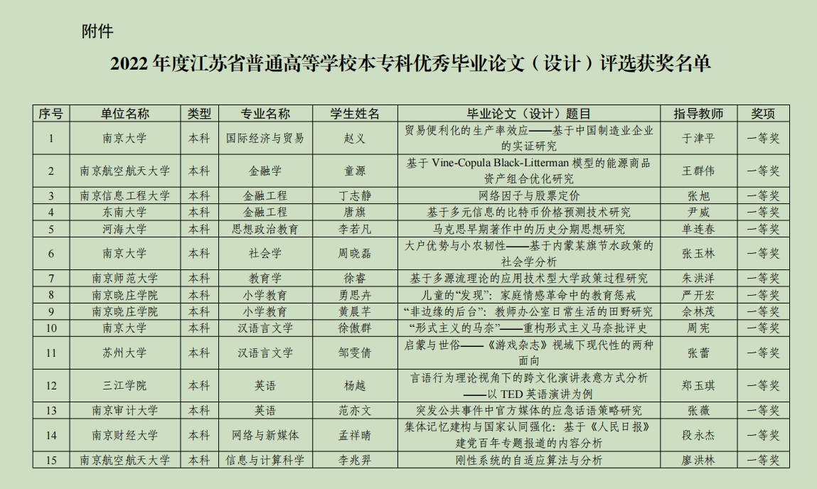 近日,江苏省教育厅发布了关于《2022年度江苏省普通高等学校优秀本专科毕业论文(设计)评定结果公示》,国产自拍