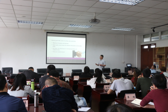 在德经楼308会议室开展了课程思政示范课程系列活动第二场。此次公开观摩由《国际贸易实务(英语)》课程组核心成员张小衡老师主讲。宣烨院长参加观摩活动并发表讲话,同时参会的还有国产自拍